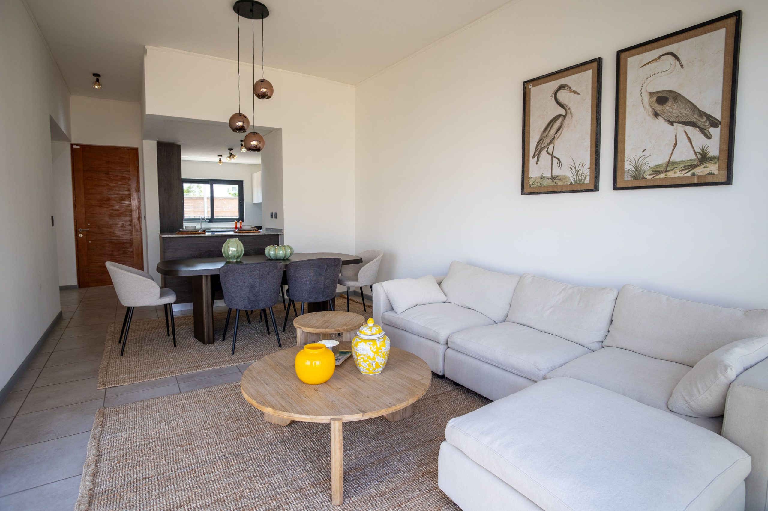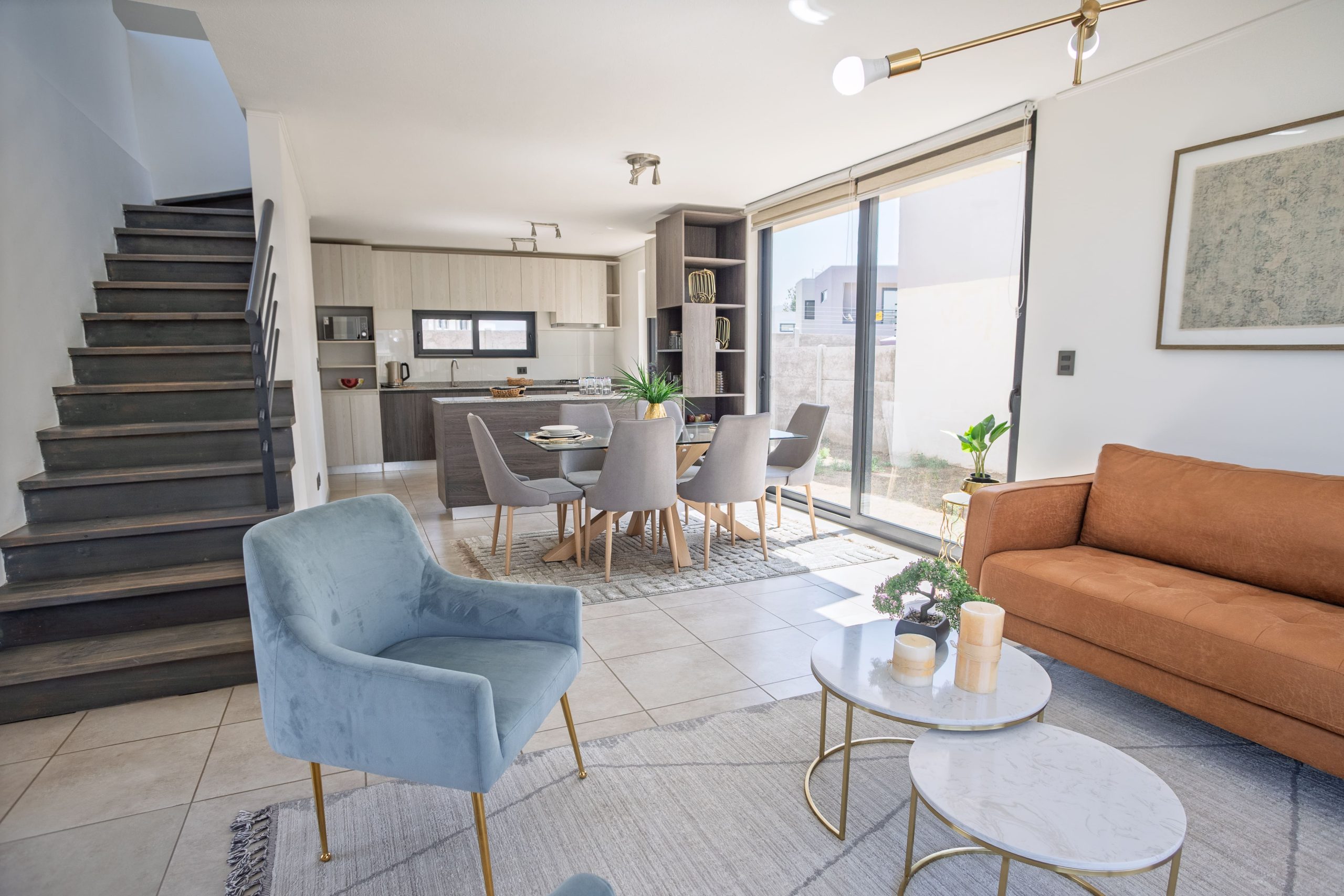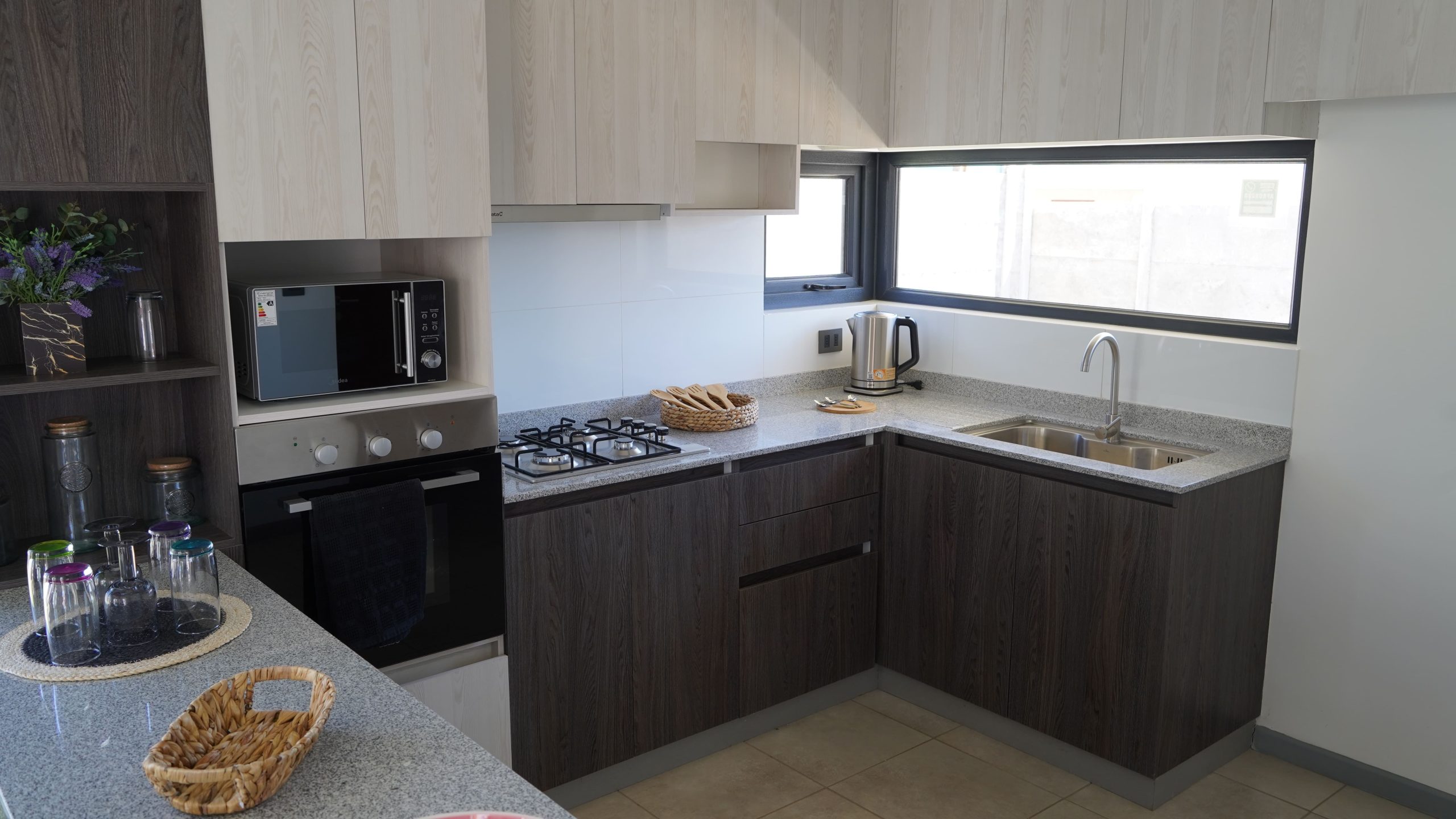 La cocina integrada se entrega completamente equipada con horno, encimera, campana y cubiertas de granito. Incorporan ventanas termopanel con perfil de PVC, y un dormitorio principal en suite con walk-in closet (modelos B y C) o closet tradicional (modelo A).